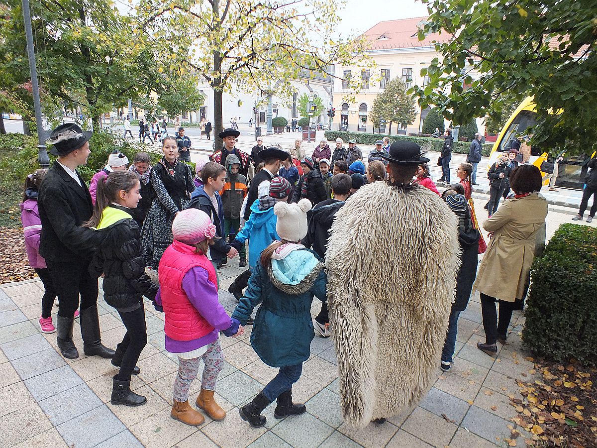 A rendezvényt színesítették a néptánc előadások, és gólyalábon járkáló kikiáltó.
